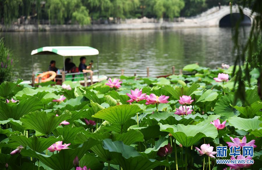 6月19日,市民在大明湖畔欣賞荷花。近日,山東濟(jì)南大明湖的荷花陸續(xù)綻放,吸引游客前來(lái)觀賞。新華社記者 王凱 攝
