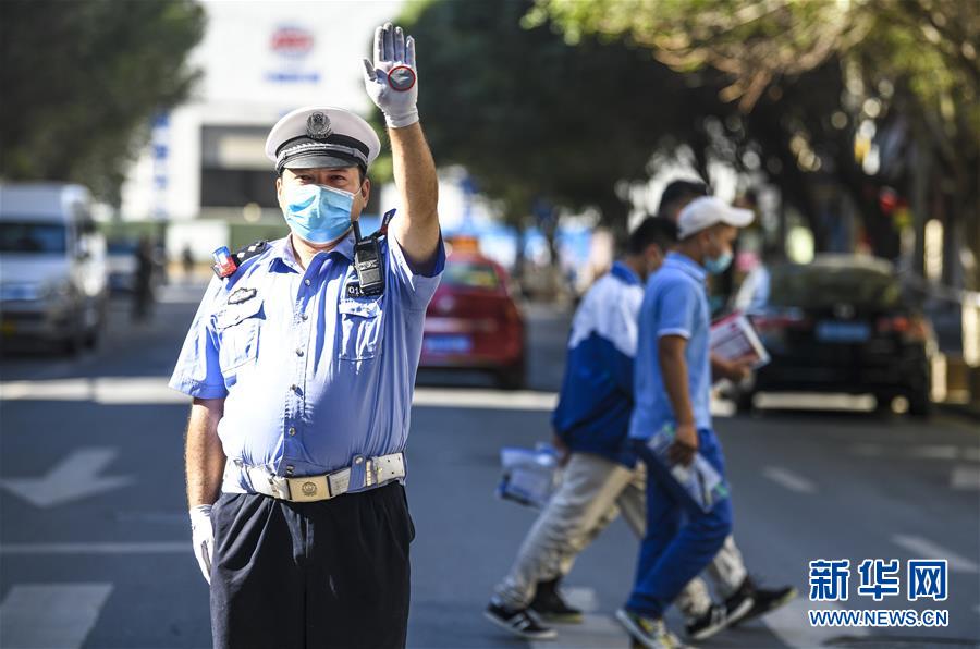 6月20日,在烏魯木齊市第二中學(xué)門前,烏魯木齊市公安局交警支隊天山區(qū)大隊新華路中隊警官艾力夏提·哈力木然提在指揮交通。當(dāng)日,烏魯木齊市初中升高中考試開始。為保障為期三天的中考順利進(jìn)行,烏魯木齊市公安局交警支隊在各考點(diǎn)執(zhí)勤,為考生保駕護(hù)航新華社記者 王菲 攝