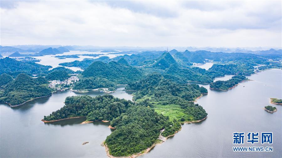 6月21日拍攝的紅楓湖景區(qū)風光(無人機照片)。夏至時節(jié),貴州省清鎮(zhèn)市紅楓湖景區(qū)草木蒼翠,秀麗的湖光山色吸引不少游客前來游玩。新華社記者陶亮攝