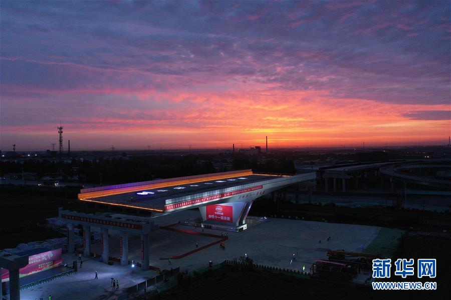 G107河北邢臺段繞城上跨京廣鐵路轉體橋實現成功轉體(6月16日無人機照片)。6月16日凌晨,由中鐵十一局承建的G107河北邢臺段繞城上跨京廣鐵路轉體橋成功完成歷時60分鐘的空中轉體。這座單墩雙肢結構轉體橋,轉體段長100米、寬34.5米,梁體總重達14200噸。新華社記者朱旭東攝