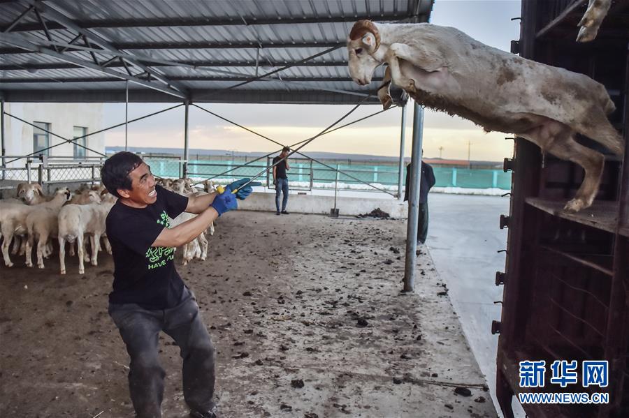 6月12日,在內(nèi)蒙古烏蘭察布東來(lái)順肉類加工廠內(nèi),工人將貨車上的綿羊引下車。近年來(lái),京蒙對(duì)口幫扶的力度不斷加大。越來(lái)越多的北京企業(yè)來(lái)到烏蘭察布,通過(guò)多種方式幫助當(dāng)?shù)刎毨У貐^(qū)的農(nóng)牧民擺脫貧困、走上致富路。新華社記者彭子洋攝