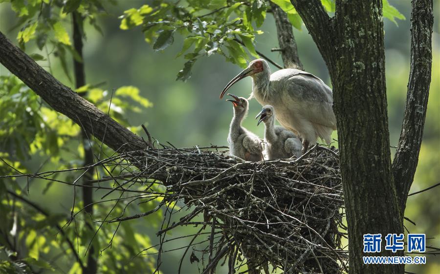 在陜西省漢中市洋縣四郎鎮(zhèn)田嶺村的一片密林里,朱鹮在巢里照看幼鳥(niǎo)(2018年6月2日攝)。記者22日從陜西省林業(yè)局了解到,據(jù)不完全統(tǒng)計(jì),曾幾近滅絕的朱鹮,其全球種群數(shù)量已超過(guò)5000只,其中中國(guó)境內(nèi)4400只,棲息地呈現(xiàn)出以秦嶺為中心向東亞歷史分布地?cái)U(kuò)展的趨勢(shì)。新華社記者陶明攝