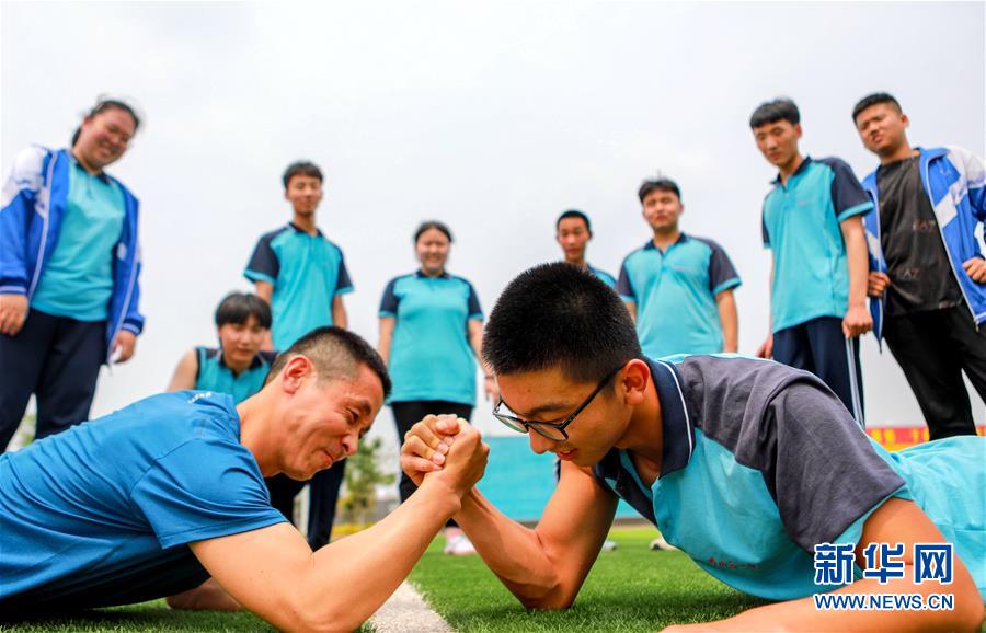6月22日,河北省邯鄲市邯山區(qū)第一中學(xué)的高三學(xué)生和老師進行“掰手腕”游戲。2020年高考臨近,河北省邯鄲市邯山區(qū)第一中學(xué)在積極做好高三學(xué)生復(fù)習(xí)備考的同時,開展多種形式的減壓活動,幫助學(xué)生釋放緊張情緒。新華社記者王曉攝