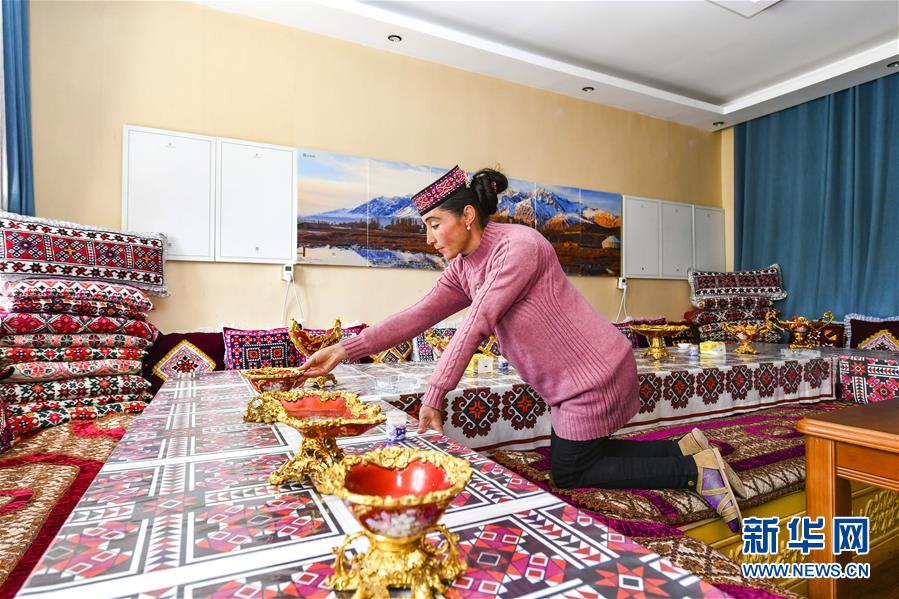 新疆塔什庫(kù)爾干塔吉克自治縣塔什庫(kù)爾干鄉(xiāng)瓦爾希迭村村民瑪依努爾古麗·依克木在民宿內(nèi)擺放物品,準(zhǔn)備招待游客(6月4日攝)。新華社記者胡虎虎攝