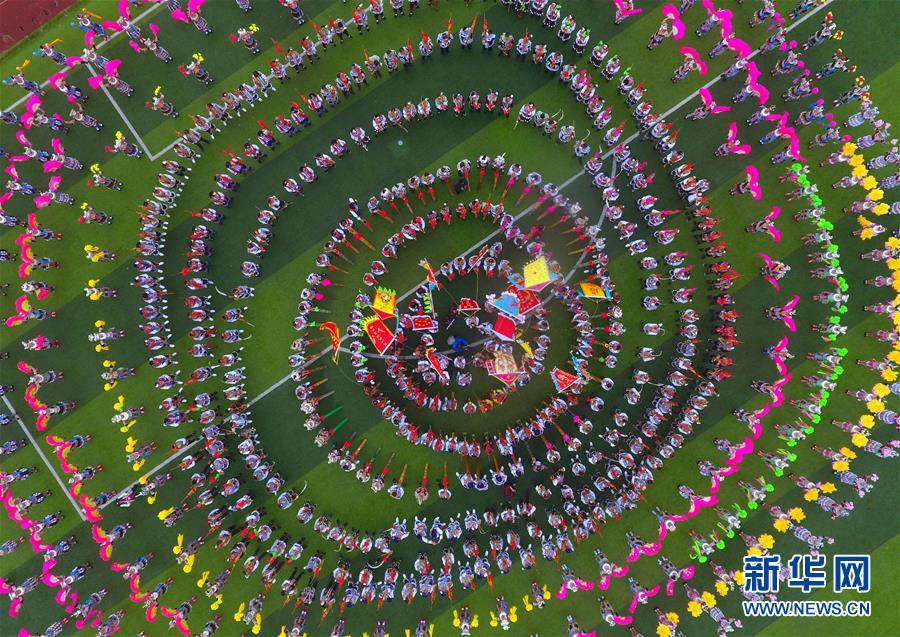 在廣西融水苗族自治縣民族體育公園,當(dāng)?shù)厝罕娫谔J笙斗馬節(jié)開幕式上表演歌舞(無人機照片,2017年11月18日攝)。新華社記者黃孝邦攝