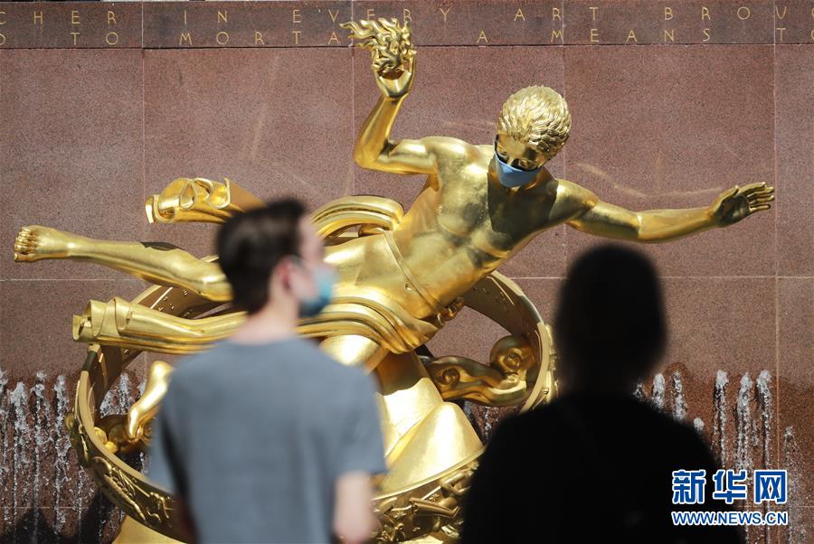 6月22日,在美國紐約洛克菲勒中心,一座雕像被“戴”上口罩。美國約翰斯·霍普金斯大學(xué)22日發(fā)布的新冠疫情最新統(tǒng)計(jì)數(shù)據(jù)顯示,美國累計(jì)死亡病例超過12萬例。新華社記者王迎攝