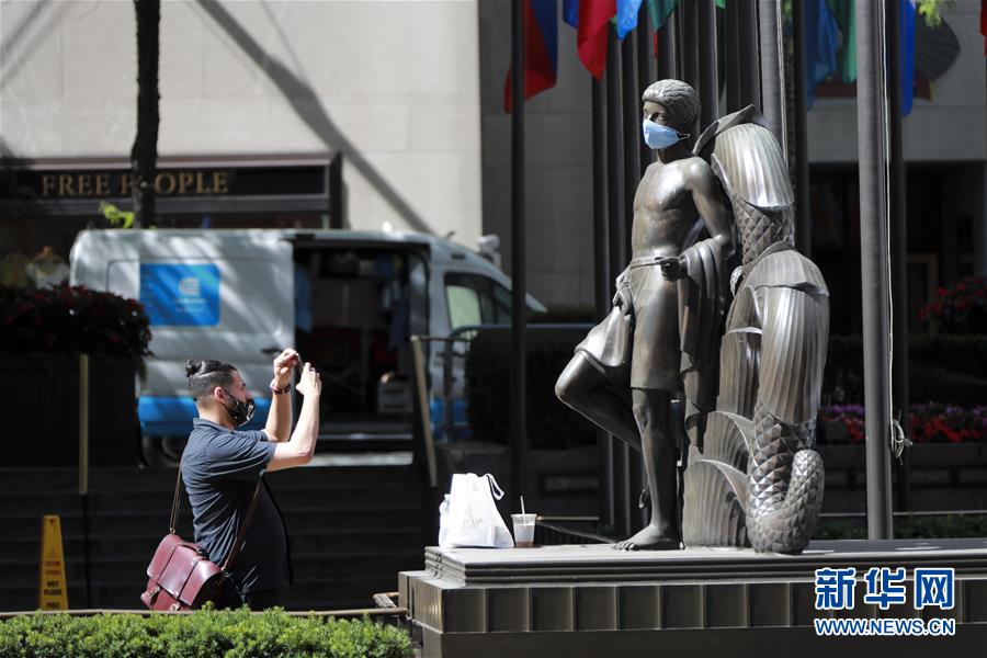 6月22日,在美國紐約洛克菲勒中心,一座雕像被“戴”上口罩。美國約翰斯·霍普金斯大學(xué)22日發(fā)布的新冠疫情最新統(tǒng)計(jì)數(shù)據(jù)顯示,美國累計(jì)死亡病例超過12萬例。新華社記者王迎攝