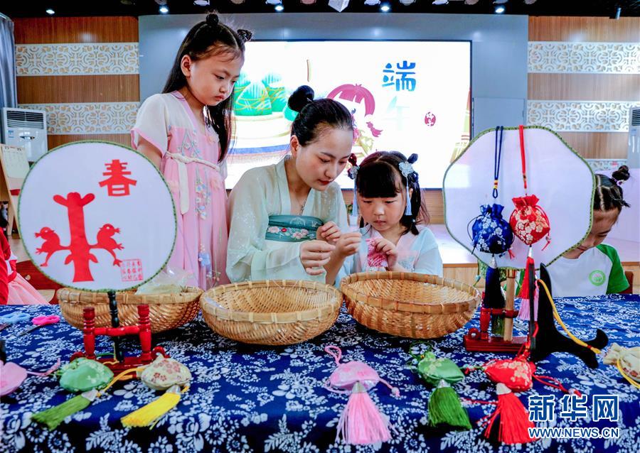 6月23日,長(zhǎng)興縣李家巷鎮(zhèn)中心幼兒園的孩子們?cè)诶蠋煹膸ьI(lǐng)下,一起制作端午香囊。為了迎接即將到來(lái)的端午節(jié),浙江省湖州市長(zhǎng)興縣各個(gè)幼兒園開展“品民俗迎端午”主題活動(dòng),讓小朋友們體驗(yàn)傳統(tǒng)民俗文化。新華社記者徐昱攝