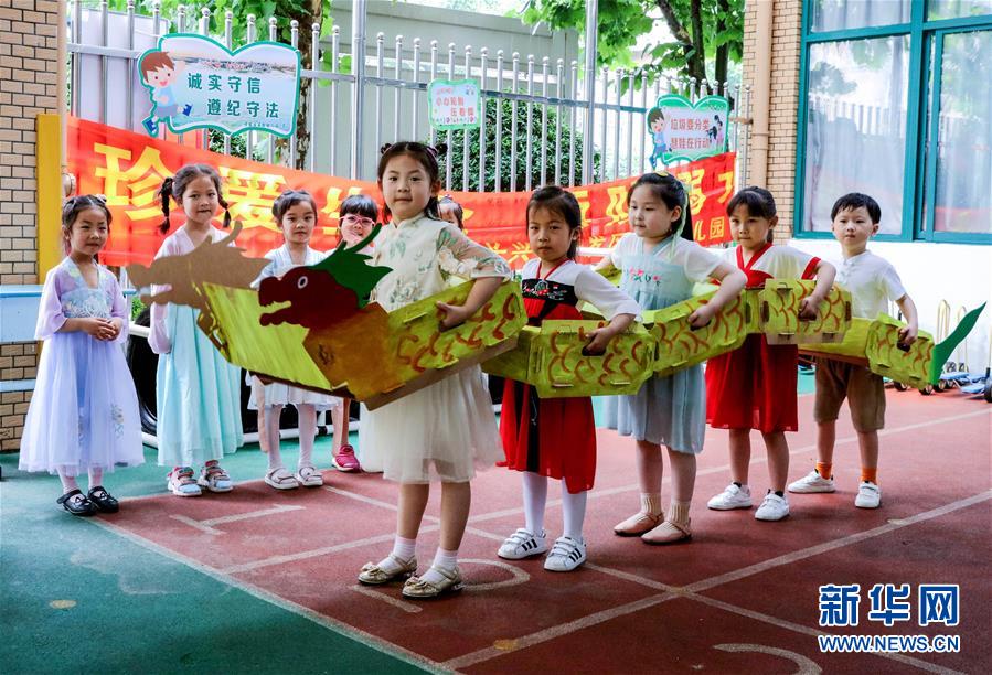 6月23日,長(zhǎng)興縣開發(fā)區(qū)實(shí)驗(yàn)幼兒園的孩子們用廢舊的紙箱做成“龍舟”進(jìn)行表演。為了迎接即將到來(lái)的端午節(jié),浙江省湖州市長(zhǎng)興縣各個(gè)幼兒園開展“品民俗迎端午”主題活動(dòng),讓小朋友們體驗(yàn)傳統(tǒng)民俗文化。新華社記者徐昱攝
