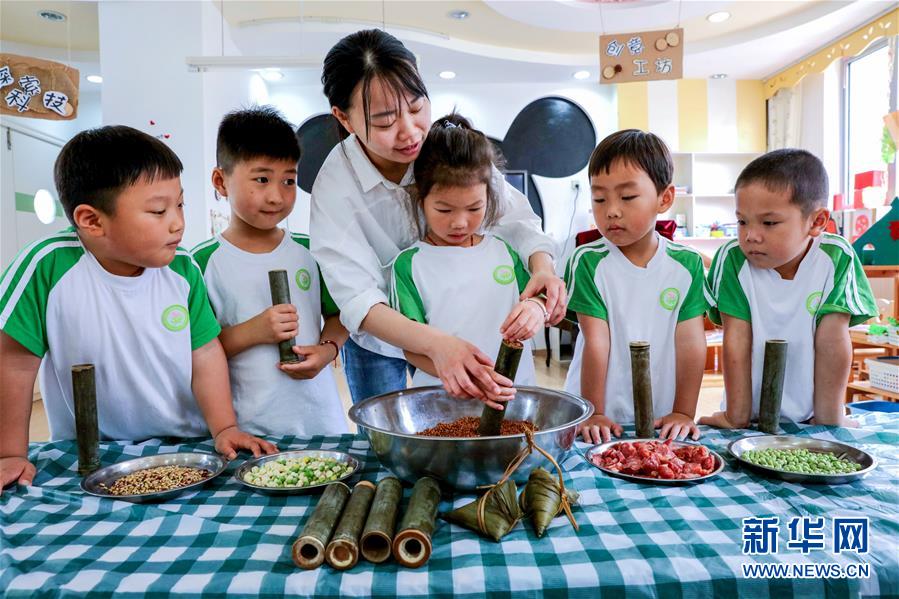 6月23日,長(zhǎng)興縣李家巷鎮(zhèn)中心幼兒園的孩子們?cè)诶蠋煹膸ьI(lǐng)下,一起學(xué)習(xí)制作端午粽子和竹筒飯。為了迎接即將到來(lái)的端午節(jié),浙江省湖州市長(zhǎng)興縣各個(gè)幼兒園開展“品民俗迎端午”主題活動(dòng),讓小朋友們體驗(yàn)傳統(tǒng)民俗文化。新華社記者徐昱攝