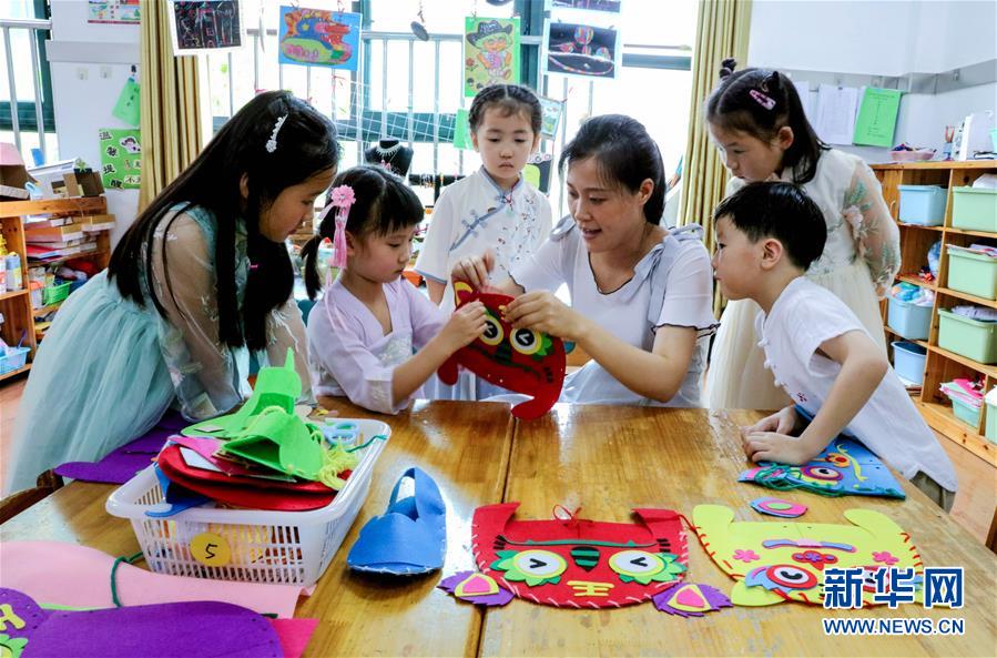 6月23日,長(zhǎng)興縣開發(fā)區(qū)實(shí)驗(yàn)幼兒園的孩子們?cè)诮處熤笇?dǎo)下學(xué)做虎頭鞋、虎頭帽。為了迎接即將到來(lái)的端午節(jié),浙江省湖州市長(zhǎng)興縣各個(gè)幼兒園開展“品民俗迎端午”主題活動(dòng),讓小朋友們體驗(yàn)傳統(tǒng)民俗文化。新華社記者徐昱攝