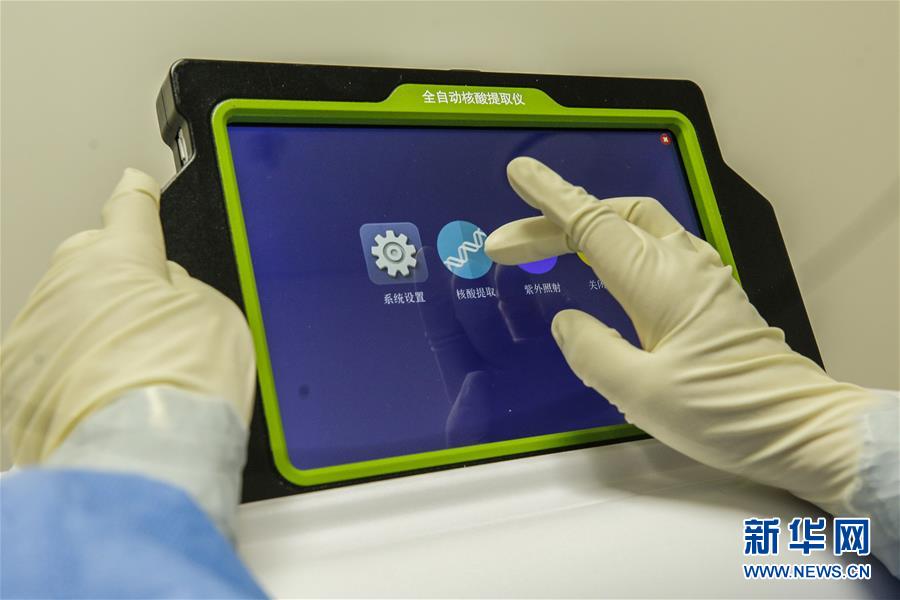 6月23日,檢驗人員操作全自動核酸提取儀。6月15日,北京市普仁醫(yī)院PCR實(shí)驗室正式啟用,并立即投入到新冠肺炎病毒核酸檢測工作之中,為新冠肺炎疫情防控增添利器。普仁醫(yī)院PCR實(shí)驗室啟用以來,除了來自本院發(fā)熱門診、門急診、病房和核酸檢測采樣點(diǎn)的樣本之外,還承接了社區(qū)以及東城區(qū)集中核酸檢測點(diǎn)采集的部分樣本。新華社記者張玉薇攝