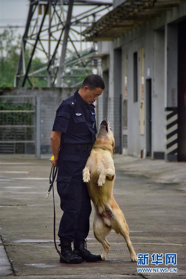 6月24日,訓(xùn)導(dǎo)員周吉榮調(diào)教緝毒犬“多多”。新華社記者 鄭夢雨 攝