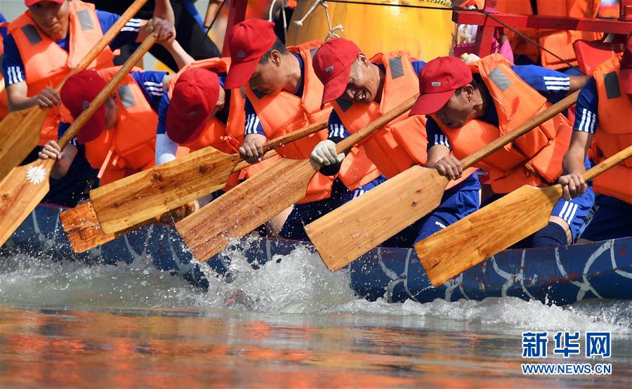6月25日,參賽龍舟隊(duì)在比賽中。當(dāng)日是農(nóng)歷五月初五,是中國(guó)民間的傳統(tǒng)節(jié)日端午節(jié)。陜西省安康市第20屆龍舟節(jié)在漢江上舉行。每年端陽(yáng)節(jié)前后,安康沿江一帶的縣區(qū)都舉行龍舟賽,賽龍舟成為民間自發(fā)的盛大活動(dòng)。新華社記者 陶明 攝