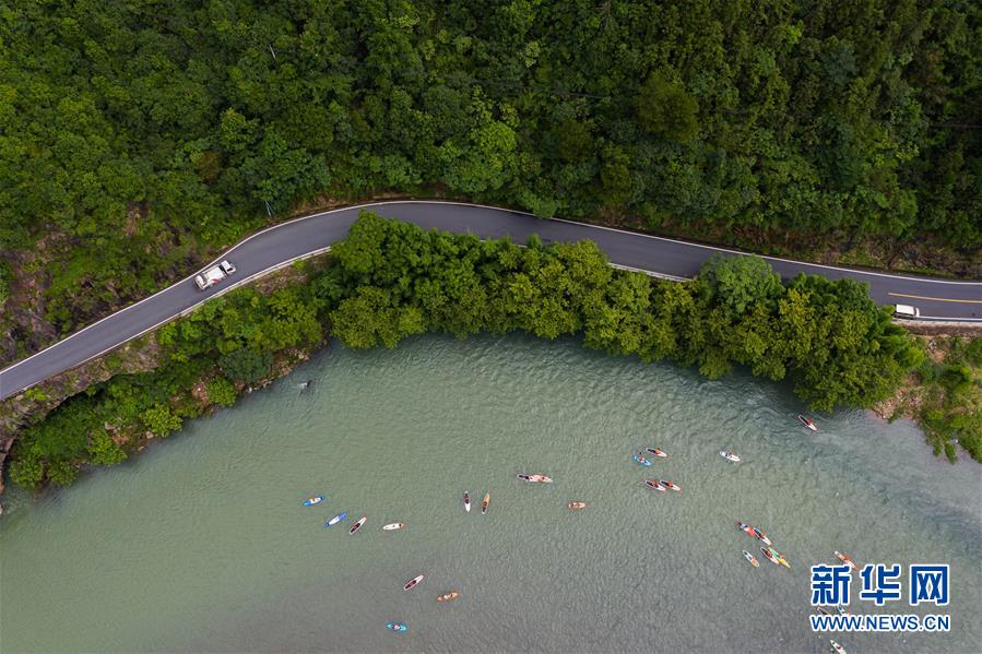 水上運(yùn)動愛好者在杭州市富陽區(qū)湖源鄉(xiāng)的壺源溪上體驗(yàn)槳板運(yùn)動的樂趣(6月28日攝,無人機(jī)照片)。近期,浙江省杭州市富陽區(qū)場口鎮(zhèn)、常安鎮(zhèn)和湖源鄉(xiāng)組團(tuán)開啟了一場夏季“綠水青山嘉年華”。這幾個(gè)壺源溪流域鄉(xiāng)鎮(zhèn)整合生態(tài)旅游資源,組團(tuán)開發(fā)山村旅游項(xiàng)目,游客可以參與壺源溪水上游樂、露營永安山頂、特色農(nóng)產(chǎn)品集市和瓜果節(jié)等特色活動。新華社記者徐昱攝