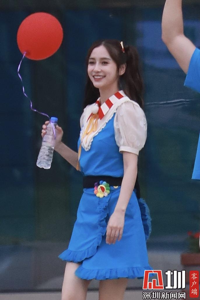 楊穎(angelababy)穿藍色背帶裙扎雙馬尾清新可愛