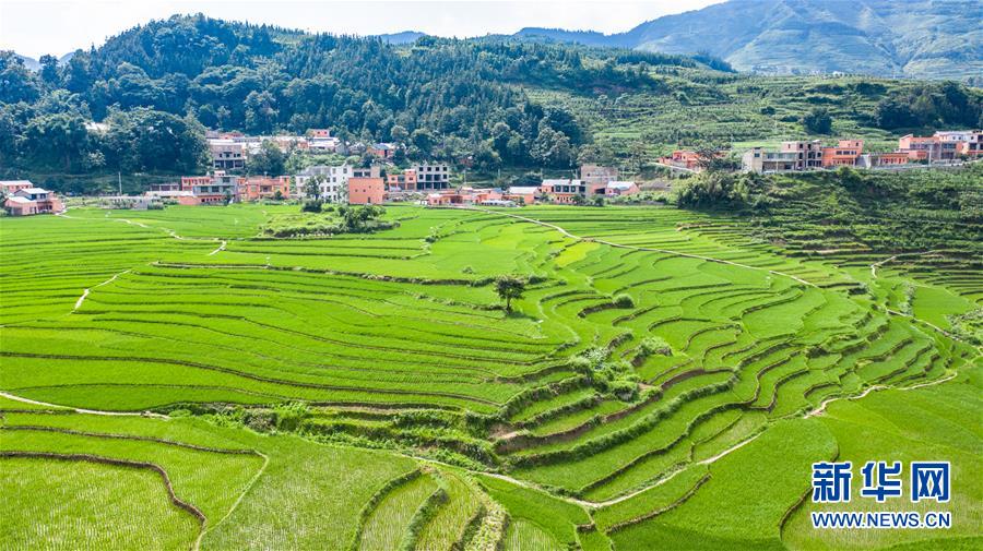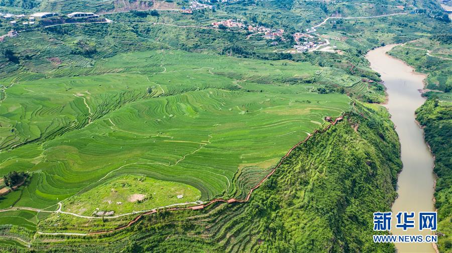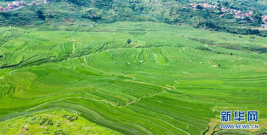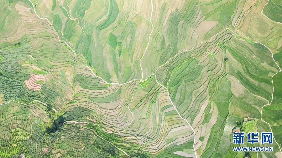 貴州省盤州市新民鎮(zhèn)的梯田風(fēng)光(6月29日攝,無人機(jī)照片)。夏日時(shí)節(jié),貴州省盤州市新民鎮(zhèn)的梯田風(fēng)景如畫。新華社記者陶亮攝