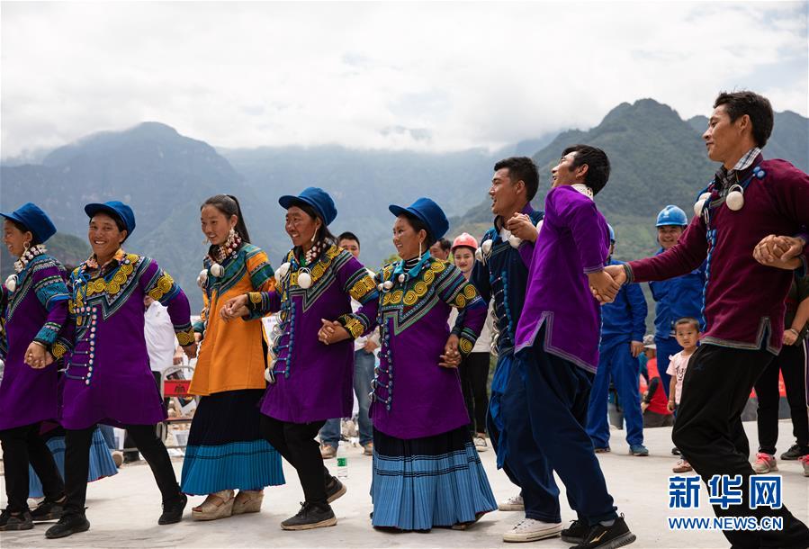 6月29日,阿布洛哈村村民身著彝族傳統(tǒng)服飾載歌載舞慶祝通村公路通車。新華社記者江宏景攝