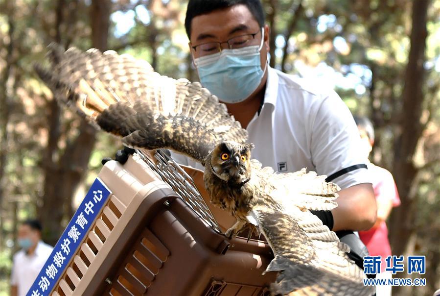 7月1日,吉林省野生動物救護(hù)繁育中心工作人員放飛一只長耳鸮。當(dāng)日,吉林省東北虎園舉行放飛活動,吉林省野生動物救護(hù)繁育中心救護(hù)的40只珍稀野生鳥類成功放歸自然。新華社記者林宏攝