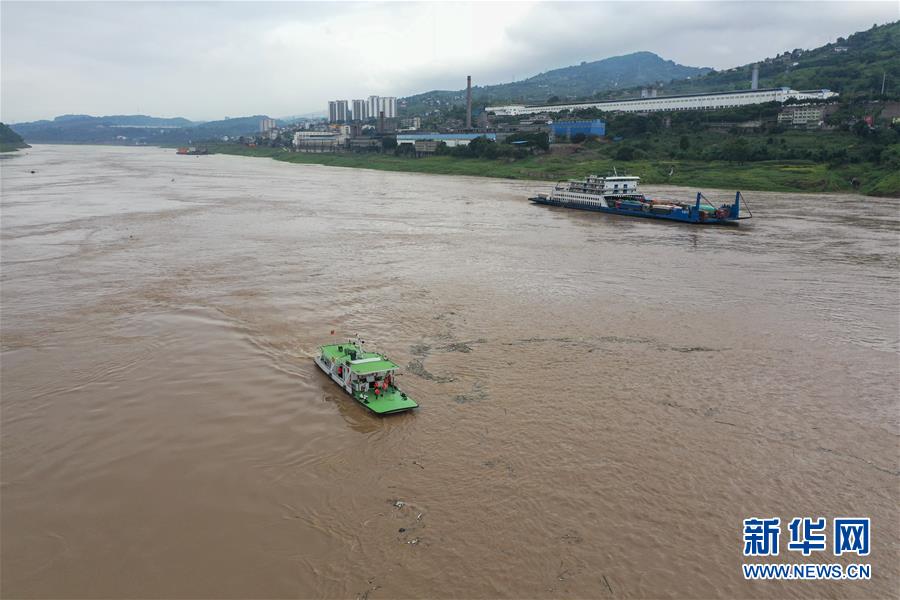 7月2日,長江清溪場水文站的水文作業(yè)船(左)在長江上進(jìn)行水文測量作業(yè)(無人機(jī)照片)。新華社記者劉潺攝