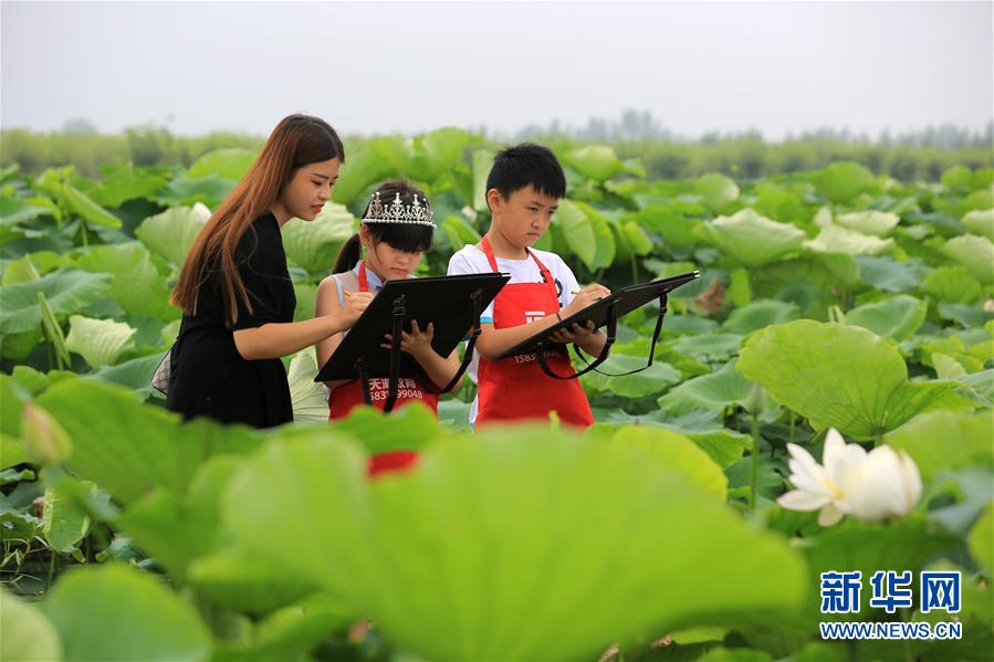 7月3日,游客在曲周縣勝豐蓮藕種植專業(yè)合作社荷塘景區(qū)寫生。時(shí)值夏日,河北省曲周縣勝豐蓮藕種植專業(yè)合作社荷塘景區(qū)的荷花競相綻放,吸引眾多游人前來觀光游覽。新華社記者 王曉 攝