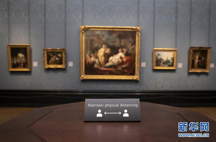 這是7月4日在英國國家美術(shù)館拍攝的提醒人們保持安全距離的提示牌。新華社記者韓巖攝