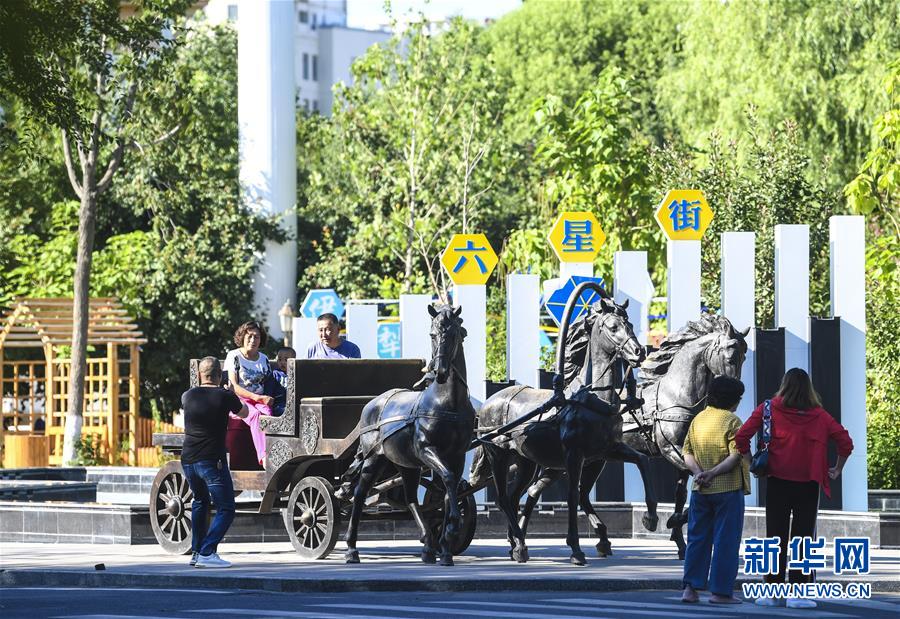 7月5日,游客在六星街的馬車雕塑前觀光拍照。新華社記者王菲攝