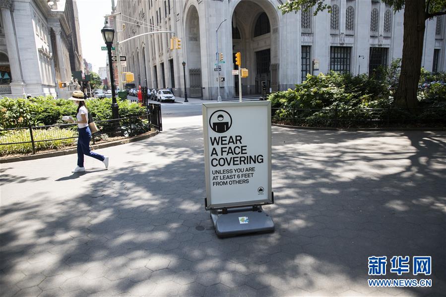 7月6日,行人走過美國紐約一處提醒人們佩戴口罩的標(biāo)牌。新華社記者王迎攝