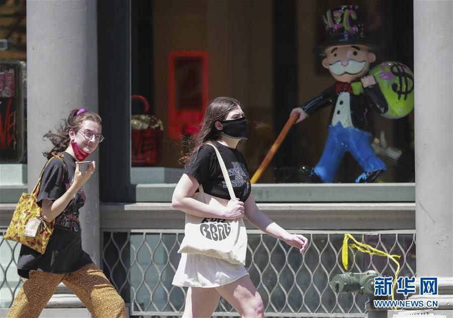 7月6日,佩戴口罩的行人走過(guò)美國(guó)紐約的一家糖果店。新華社記者王迎攝