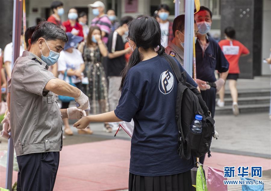 7月7日,江西省南昌市豫章中學(xué)考點(diǎn)工作人員為考生測(cè)量體溫。當(dāng)日,2020年高考拉開(kāi)帷幕。新華社記者張浩波攝