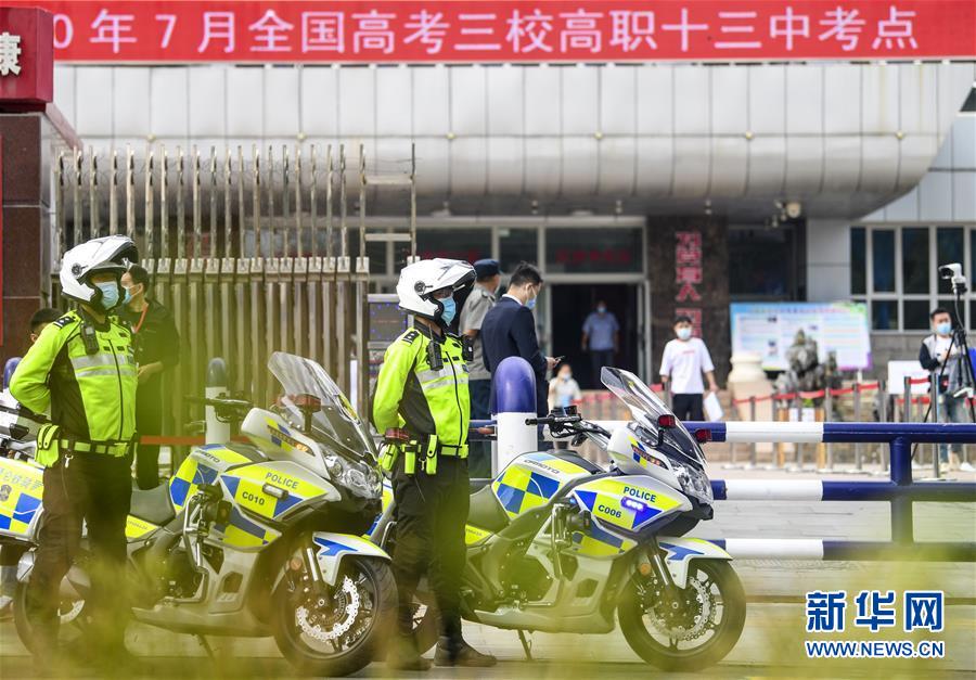 7月7日,在烏魯木齊市第十三中學(xué)考點(diǎn)外,烏魯木齊市公安局交通警察支隊(duì)特勤大隊(duì)昆侖鐵騎騎警孟凡超(右)與梁劍在執(zhí)勤。當(dāng)日,2020年高考拉開帷幕。新華社記者王菲攝