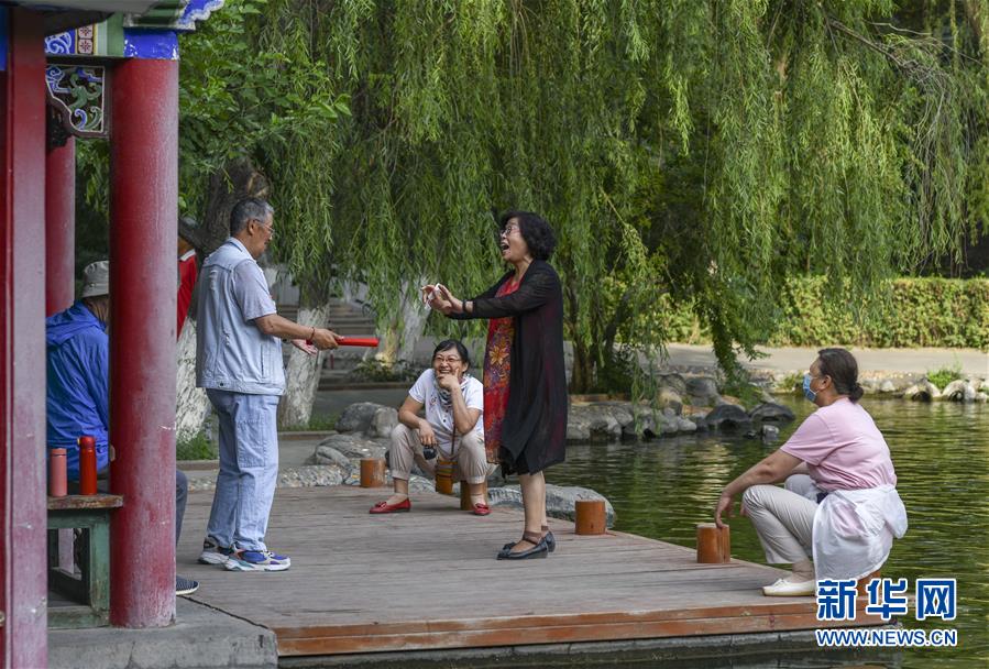 在烏魯木齊人民公園的一處角落里,戲迷們在練唱(7月5日攝)。新華社記者趙戈攝