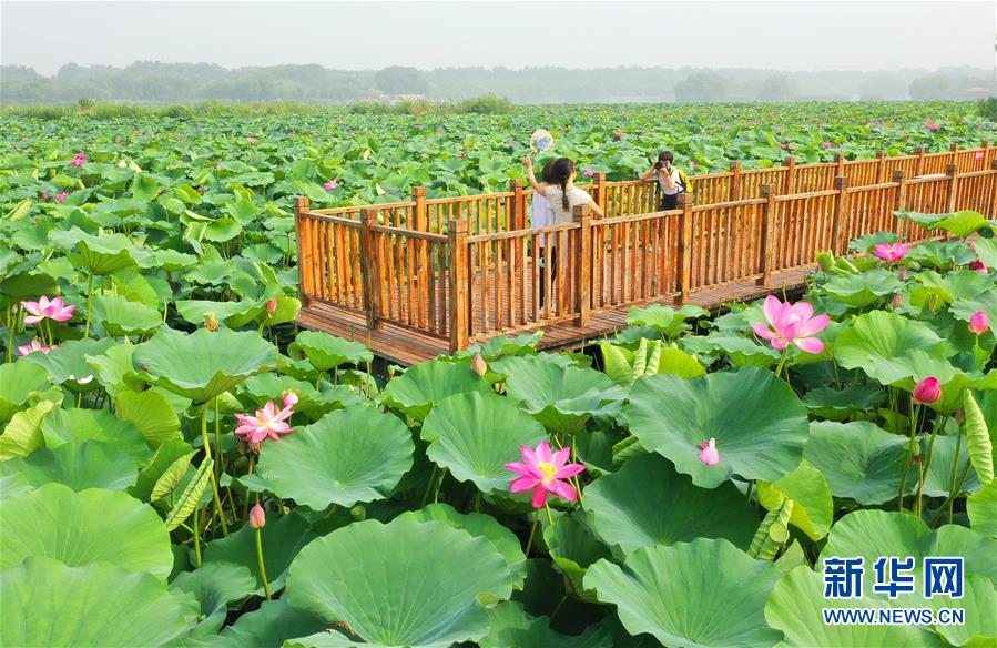 7月7日,游客在唐山市南湖公園的觀(guān)荷棧橋上拍照(無(wú)人機(jī)照片)。近日,河北省唐山市南湖公園內(nèi)荷花競(jìng)相綻放,呈現(xiàn)出“接天蓮葉無(wú)窮碧,映日荷花別樣紅”的美麗景象,吸引了眾多游客前來(lái)觀(guān)賞。新華社記者楊世堯攝