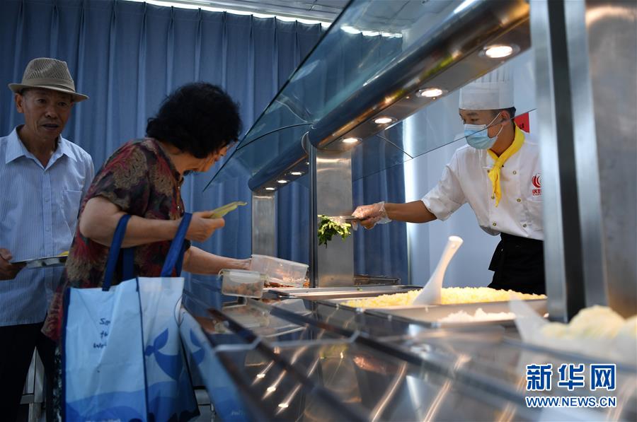 7月7日,老人在付村康養(yǎng)中心(老人家食堂)取餐。新華社記者李然攝