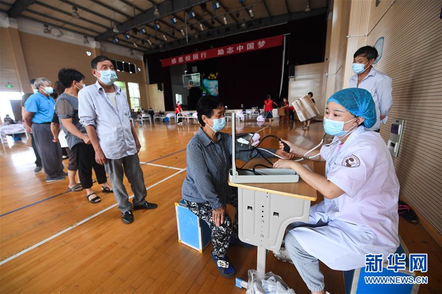 7月8日,在杭州市富陽區(qū)東洲街道安置點東洲中心小學(xué),醫(yī)護(hù)人員在給村民測量血壓。新華社記者徐昱攝