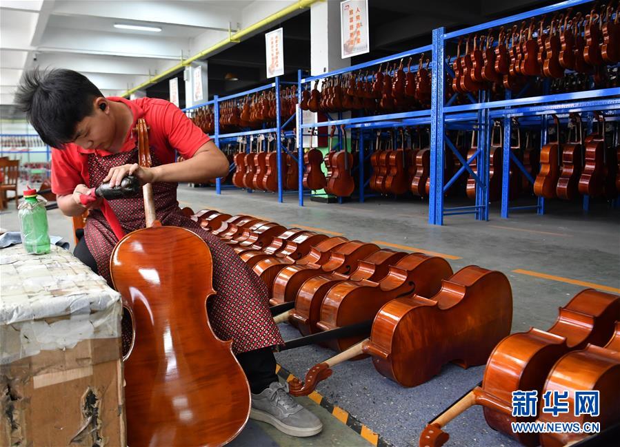 工人在河南駐馬店市確山縣提琴產(chǎn)業(yè)園提琴生產(chǎn)車(chē)間打磨琴頭(6月23日攝)。新華社記者李嘉南攝