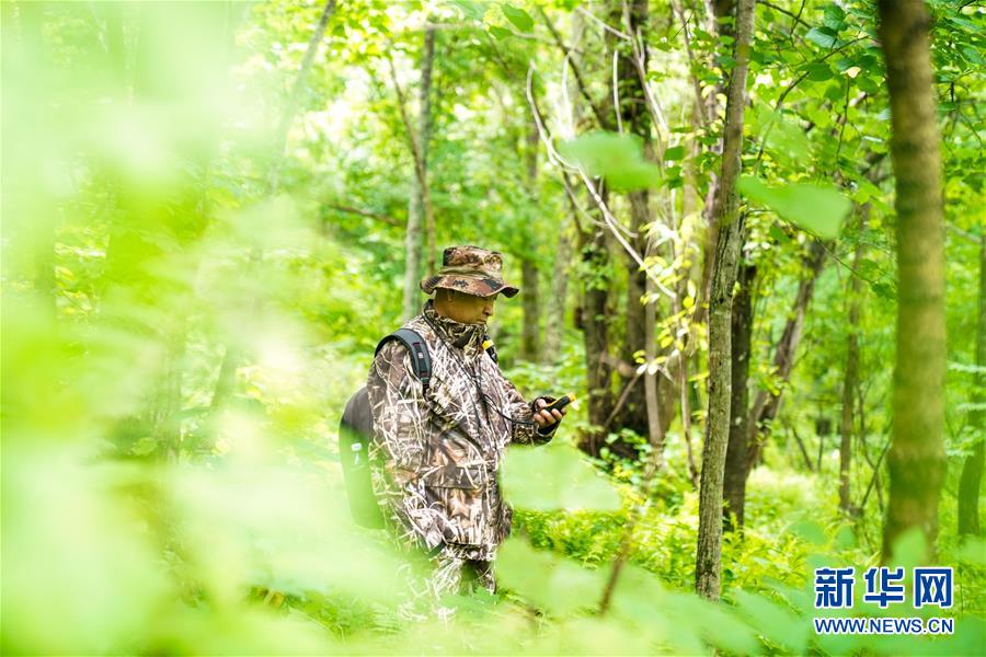 董紅雨在迎春林業(yè)局有限公司施業(yè)區(qū)內(nèi)進行野生東北虎信息搜集和巡護工作(7月8日攝)。新華社記者馬曉成攝