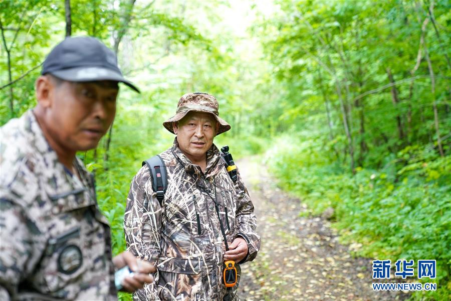 董紅雨(右)在迎春林業(yè)局有限公司施業(yè)區(qū)內(nèi)向當(dāng)?shù)鼐用袼鸭吧鷸|北虎的蹤跡信息(7月8日攝)。新華社記者馬曉成攝