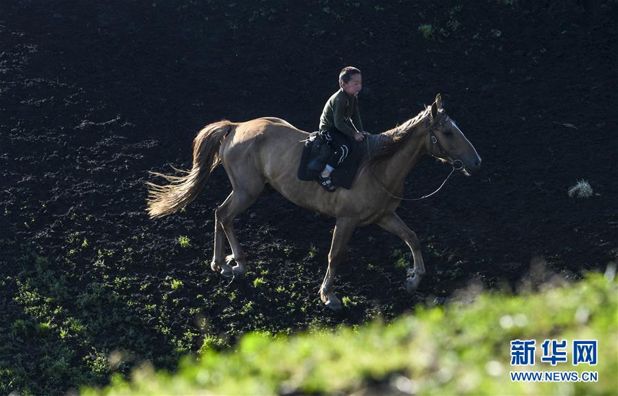 在新疆特克斯縣境內(nèi)的夏牧場(chǎng)里,小朋友跟隨家人一起放牧(6月30日攝)。新華社記者王菲攝