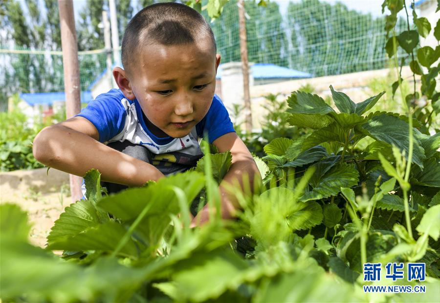 在新疆特克斯縣境內(nèi)的牧民定居點(diǎn),一名小朋友幫家人采摘自家種植的水果(7月6日攝)。新華社記者王菲攝