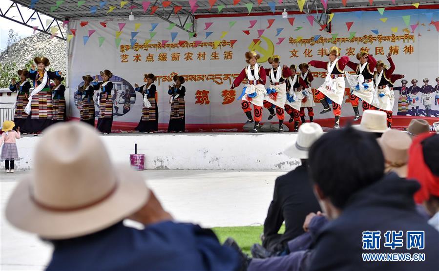 山南市扎囊縣桑耶鎮(zhèn)乃卡村村民觀看文藝演出隊(duì)的表演(7月7日攝)。西藏自治區(qū)山南市為弘揚(yáng)民族文化,加強(qiáng)村居精神文明建設(shè),組建了560余個行政村文藝演出隊(duì)。演員來自百姓,服務(wù)百姓,一年四季都有演出,豐富了百姓的文化生活。新華社記者張汝鋒攝