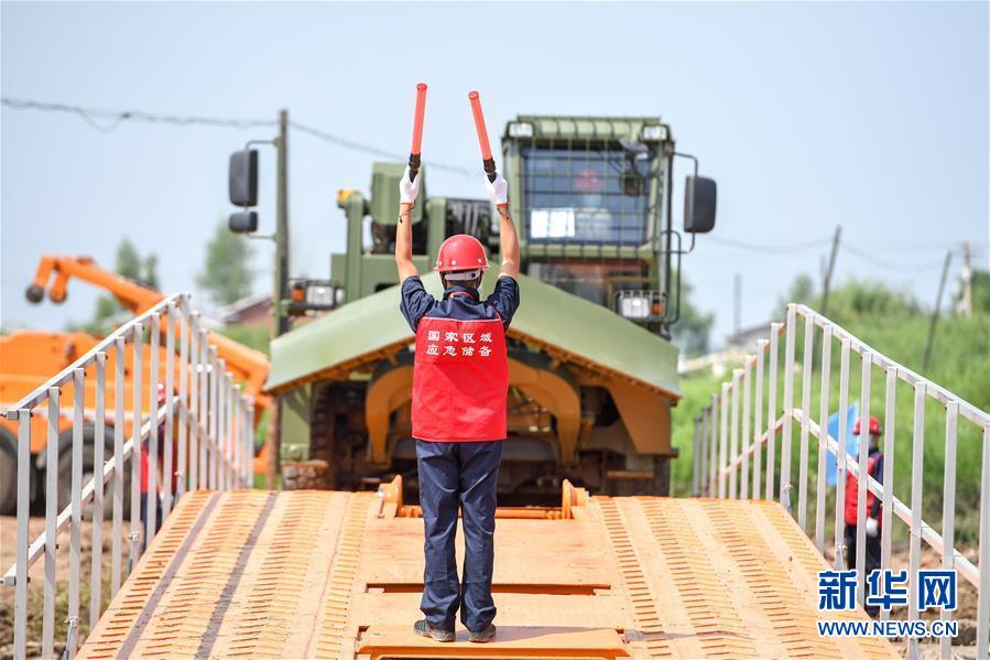7月10日,工作人員引導多功能應急搶險車安全過橋。當日,由吉林省交通運輸廳主辦的公路橋梁水毀搶通應急演練在長春市雙陽區(qū)雙陽河舉行,參與演練人員從汛情水毀信息報送、應急裝備快速集結、機械化橋梁搶通搭設、善后處理等方面進行實戰(zhàn)演練。新華社記者張楠攝