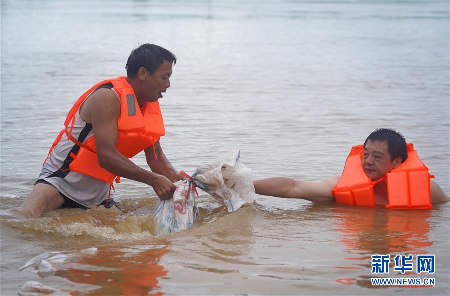 7月9日,為應對洪峰到來,邵忠如(左)在水中加固圩堤。新華社記者萬象攝