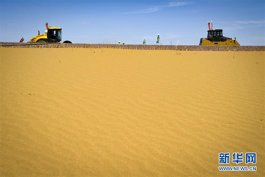 7月10日,工人在位于寧夏境內(nèi)的烏瑪高速青銅峽至中衛(wèi)段A10標(biāo)段施工。盛夏時(shí)節(jié),位于寧夏境內(nèi)的烏瑪(內(nèi)蒙古烏海市至青海瑪沁縣)高速青銅峽至中衛(wèi)段正在抓緊施工建設(shè)。該路段主線全長(zhǎng)122.9公里,其中穿越騰格里沙漠腹地的18公里公路是寧夏建設(shè)的首條沙漠高速公路,預(yù)計(jì)2021年建成通車。新華社記者馮開華攝。