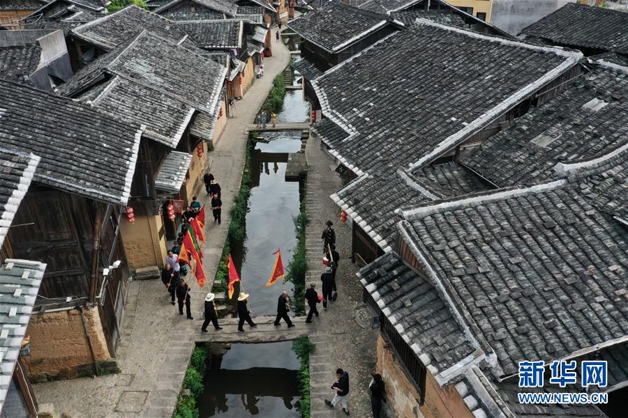 7月4日,浦源村民展示魚祭習(xí)俗(無(wú)人機(jī)照片)。魚祭習(xí)俗是為死去的鯉魚舉行送葬儀式,是浦源村特有的習(xí)俗。新華社記者 姜克紅 攝