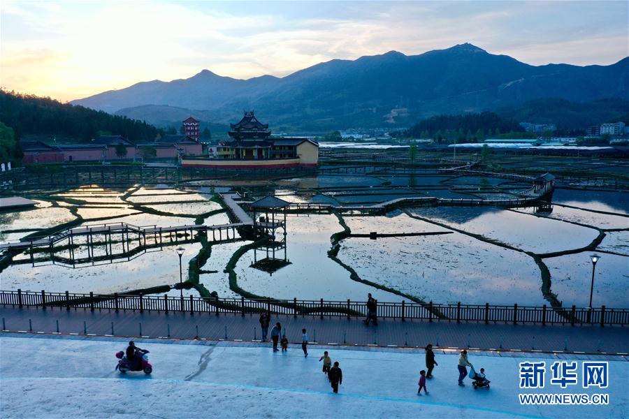 4月17日傍晚時(shí)分,人們?cè)谄衷创艴庺~溪公園散步休閑(無(wú)人機(jī)照片)。新華社記者 姜克紅 攝