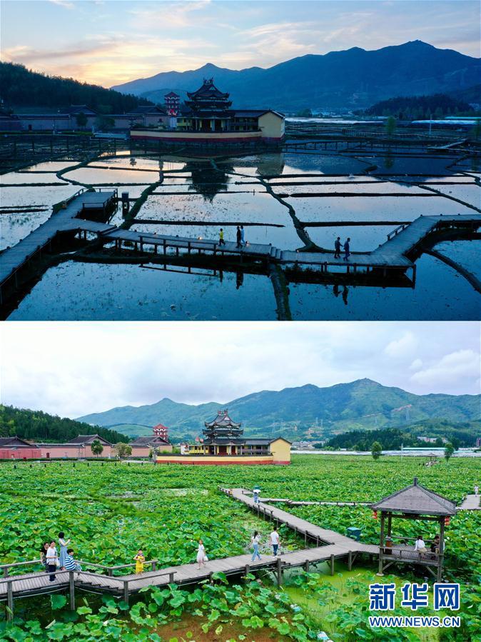7月3日,浦源村鯉魚溪公園內(nèi)荷花盛開,吸引游人前來(lái)觀賞(無(wú)人機(jī)照片)。新華社記者 姜克紅 攝