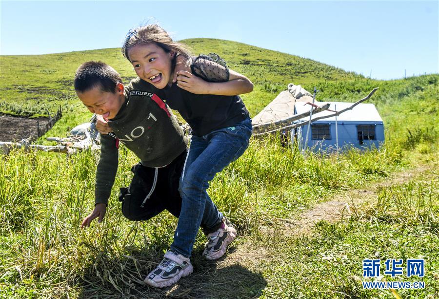 在新疆伊犁特克斯縣境內(nèi)的夏牧場里,兩名小朋友在玩耍(7月2日攝)。新華社記者 王菲 攝