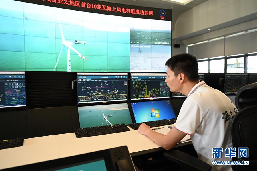 7月12日,三峽福建海上風電集控中心工作人員在調試首臺10兆瓦海上風電機組。記者7月13日從三峽集團了解到,國內首臺10兆瓦海上風電機組日前在三峽集團福建福清興化灣二期海上風電場成功并網(wǎng)發(fā)電,這是目前我國自主研發(fā)的單機容量亞太地區(qū)最大、全球第二大的海上風電機組,刷新了我國海上風電單機容量新紀錄。新華社記者 林善傳 攝