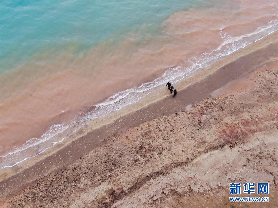 在可可西里索南達(dá)杰保護(hù)站管護(hù)區(qū)域內(nèi)的湖泊附近,龍周才加(中)與隊友才仁多杰(左)、王文豪在巡視(6月30日攝,無人機(jī)照片)。新華社記者 張龍 攝
